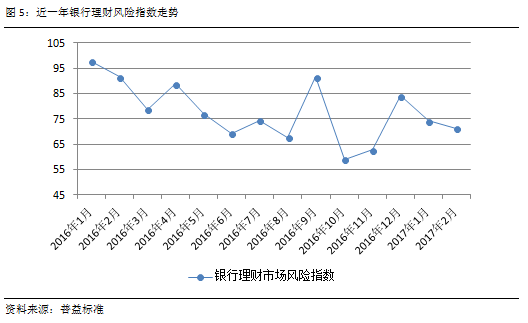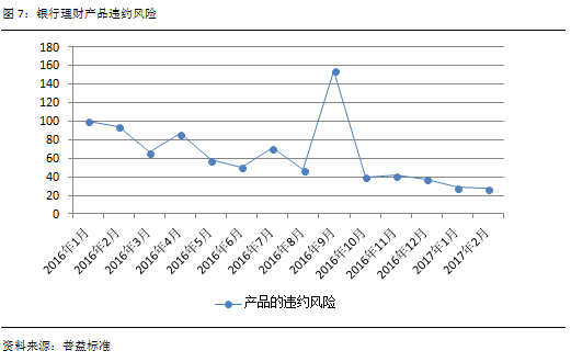 2017年2月产品违约风险的下滑幅度有所收窄,这是由于该类风险已处于较低水平,向下空间不足,违约概率极小。未来央行牵头实现资管业监管统一后,银行理财的刚性兑付或将打破,产品的违约风险有较大概率上行。