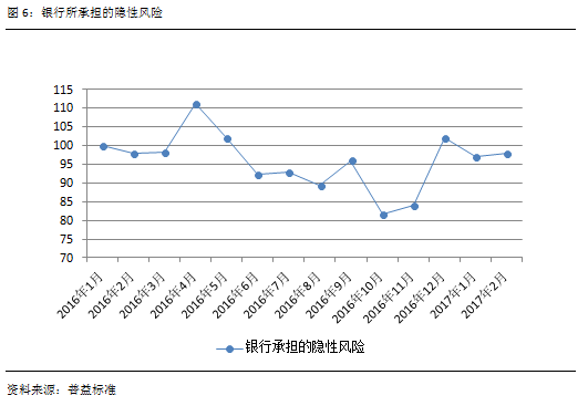 在此之后,银行迅速调整了投资方向,加重了货币市场工具和非标债权的投资比例以取代对债券市场的过分倚重,促使银行承担的隐性风险也迅速下滑。但是进入2月份由于银行兑付压力增大,其承担的隐性风险又略有回升。截止2017年2月,该风险的指数达到97.93点。