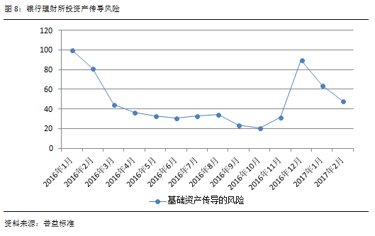 基础资产传导的风险是指由银行理财所投资的基础资产传递的风险。在2016年基础资产传导风险整体呈现明显下滑表现,但在2016年12月债券市场风险事件爆发后,此类风险迅速攀升,在12月当月便已上升至90点。