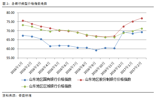 从横向比较来看,股份制银行和区域银行整体收益维持在相对较高水平,而国有银行产品收益则有明显差距。由于产品收益维持在较低水平,因此国有银行在12月受到资金荒的影响也相对较大,其价格指数出现了大幅攀升,几乎达到了山东地区区域银行同等水平。但进入2017年后,国有银行指数迅速放缓,并出现回落迹象,最后在2月落在了69.37点。
