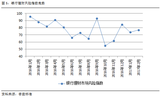 2017年2月产品违约风险的下滑幅度有所收窄,这是由于该类风险已处于较低水平,向下空间不足,违约概率极小。未来央行牵头实现资管业监管统一后,银行理财的刚性兑付或将打破,产品的违约风险有较大上升可能。