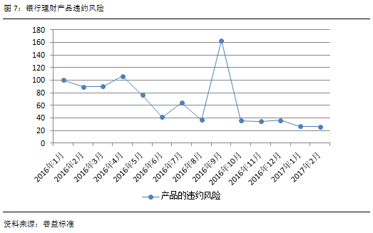 产品违约风险指的是银行理财产品到期后无法按照预期收益率兑付的风险。近期,银行理财产品的违约风险缓步下滑,仅在2016年9月出现了异常波动,这与当月较多结构性产品未能兑付最高预期收益有较大关系。