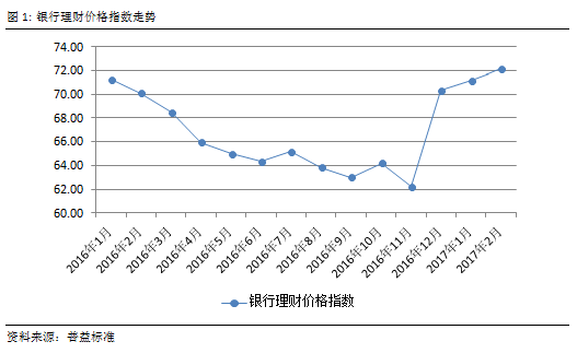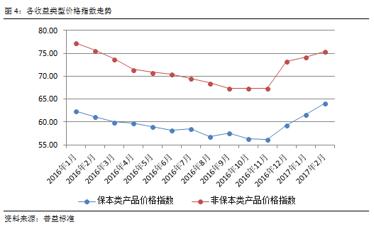 自2016年12月开始,两类产品价格指数明显回升,截止2017年2月保本类产品上涨幅度稳定,缓步攀升至64.13点,大幅超越2016年1月的62.41点。非保本类产品在12月大幅上涨8.72%,但进入2017年后,涨幅有明显放缓的表现,其2月价格指数升至75.46点,虽然仅回升至2016年3月的水平,但仍然显著高于保本类产品。整体来看,非保本理财产品的收益仍然更有吸引力。