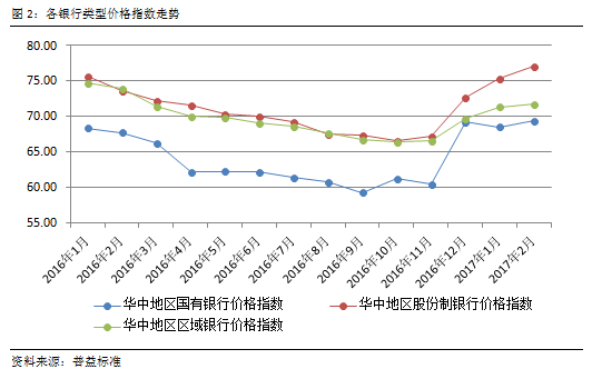从横向比较来看,股份制银行和区域银行整体收益维持在相对较高水平,而国有银行产品收益则有明显差距。由于产品收益维持在较低水平,因此国有银行在12月受到资金荒的影响也相对较大,其价格指数出现了大幅攀升,几乎达到了华中地区区域银行同等水平。但进入2017年后,国有银行指数迅速放缓,并出现回落迹象,最后在2月落在了69.31点。2017年2月,股份制银行价格指数节节攀升,已达77.07,超过2016年1月水平,大幅领先同区域的国有银行及区域银行;区域性银行在2月的涨幅相对较为平稳,仅环比上涨0.38点,与股份制银行收益差距呈现放大趋势,预计在3月受流动性压力影响,区域银行价格指数仍将维持上行表现。