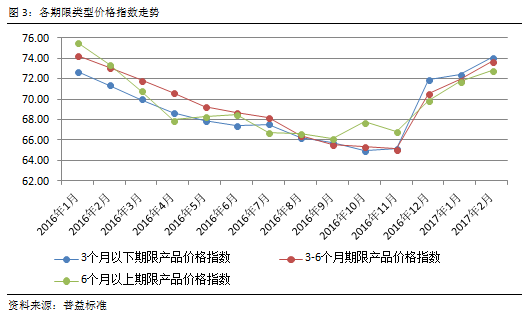 2016年12月资金荒来临后,3种期限类型的理财产品的价格指数均大幅反弹,其中3个月以下期限产品价格指数反弹幅度最强,大涨10.33%,且进入2017年后,走势仍保持稳步向上的表现。2017年2月,3类期限产品价格指数平稳上行,3个月以下期限产品价格指数涨势最强,已达74.03点,紧随其后的是3-6个月期限产品的价格指数,也达到了73.66点,而期限最长的6个月以上产品价格指数则最低,仅为72.83点。出现明显收益倒挂的主要原因是,2017年初资金紧张局面较为严重,中短期限产品需提升收益抢夺市场上的流动性资金,但预计2017年年中,流动性压力逐步释放后,资金荒的情况将得到明显缓解,长期来看其收益回落的可能性也较大,因此长期限产品的价格指数涨幅相对偏弱,不及短期产品。