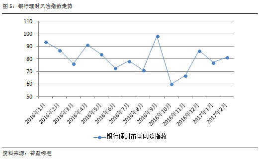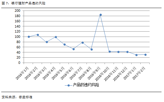 2017年2月产品违约风险的下滑幅度有所收窄,这是由于该类风险已处于较低水平,向下空间不足,违约概率极小。未来央行牵头实现资管业监管统一后,银行理财的刚性兑付或将打破,产品的违约风险有较大上升可能。