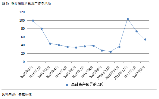 基础资产传导的风险是指由银行理财所投资的基础资产传递的风险。在2016年基础资产传导风险整体呈现明显下滑表现,但在2016年12月债券市场风险事件爆发后,此类风险迅速攀升,在12月当月便已上升至103.95点。