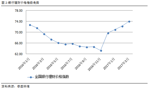 全国银行理财价格指数在3月继续维持了向上表现,环比上升2.48%,至74.02点。从2017年的表现来看,银行理财价格指数维持了较为稳定的向上表现,各月上涨幅度接近,且3月涨幅有放大态势,反映出当前银行理财产品收益有较强的竞争力,投资者可择机购入。目前,监管层对市场流动性持中信偏紧态度使得资金面大幅收紧,资金供需紧平衡局面已现。不过,3月底至4月初时,该情况已有明显好转。预计随着考核结束,整体流动性将有所宽松,理财产品价格指数在4月或将小幅回调。