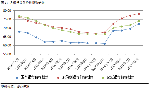 在3月中,各银行类型价格指数仍然呈现上涨趋势,但走势各有不同。其中股份制银行维持了较为稳定的涨势,环比上涨1.35%至78.21,较2月涨幅略有收窄;国有银行及区域银行则出现了上涨幅度放大的表现。其中国有银行上涨3.90%突破70点关卡,但由于国有银行在2017年初价格指数有所回落,因此从一季度来看,国有银行价格指数涨幅不如股份制银行和区域银行;全国范围的区域银行在3月涨幅与国有银行趋近,环比上涨了3.22%至74.00。各类型银行价格指数在3月持续上涨的主要原因与大量资金回笼、债券发行规模增长、监管考核临近等多方面因素共同造成的流动性收紧有紧密关系。不过随着MPA考核结束,4月市场流动性紧张将逐步缓解,预计4月下旬各类银行理财产品收益会有一定回落。