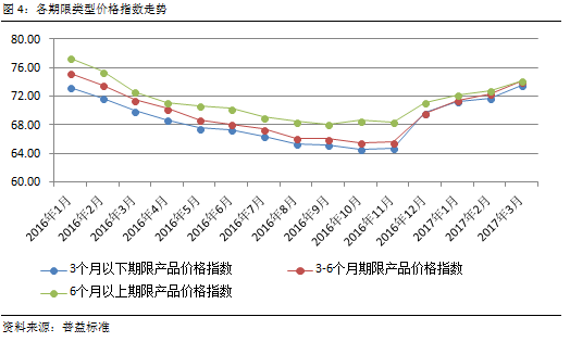 由于银行理财通常以预期收益的形式发行,因此收益与时间呈现正相关关系。由图可见,财富指数随着时间的增长持续上行,仅有单月增幅差异的变化。2017年3月,财富指数达116.28点,较2月增长0.41点,增幅为0.35%。各期限类型的产品中,6个月以上期限类型的产品财富指数最高,达117.05点;而3-6个月期限类型产品也有116.59点;3个月以下期限类型产品财富指数仅为116.04点。从近期价格指数的变化来看,短期内收益倒挂现象仍然存在,但长期的财富积累仍然展现了产品流动性越差(期限越长),收益越高的逻辑。