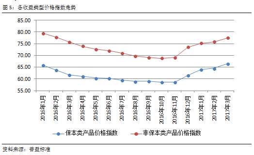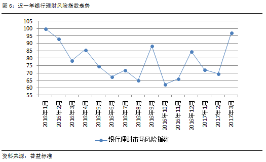 2017年3月,银行理财市场风险指数出现了飙升,从2月的69.50点上涨至97.29点,较2016年同期大幅上涨。银行理财市场风险指数的大幅上涨与近期市场流动性收紧后,商业银行被迫提升产品收益吸收资金有较大关系。在基础资产收益没有明显改善的情况下,大幅提升了产品收益即增加了银行所承担的产品违约的风险,因此银行理财市场风险指数迅速上升。不过对于投资者而言,在刚性兑付的未打破前,该风险不会转嫁给投资者,因此对于投资者而言投资银行理财产品仍然是资产保值的较优选择。