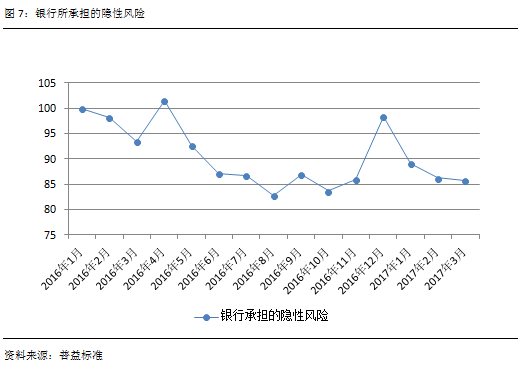 银行承担的隐性风险在2017年1季度有明显回落,全国范围的表现与区域的表现差异较为明显,主要原因为全国性银行已经开始逐步转型,净值型产品增多,因此银行整体承担的隐性风险变随之降低。至3月为止,银行承担的隐性风险指数为85.74环比下滑0.56%。