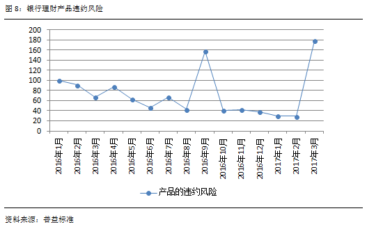 产品违约风险指的是银行理财产品到期后无法按照预期收益率兑付的风险。近期,银行理财产品的违约风险总体呈现缓步下滑的趋势,但在2017年3月,受流动资金回笼、美联储加息、监管考核临近等多方面因素的影响,市场流动性大幅收紧,致使资金的供需极不平衡,其中银行间7天回购利率大涨至3.85%,为两年内最高。基于此情况,银行理财迅速提升收益抢夺市场流动性,但在基础资产收益没有上涨的情况下,大幅提升收益率必然致使违约风险高升,这也导致产品违约风险指数疯狂上涨,至178.53点。随着市场流动性压力缓解,违约风险将在4月出现明显回落。