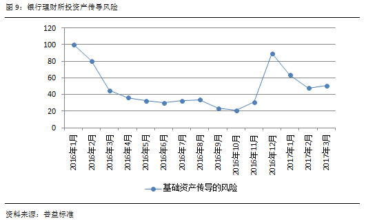 2017年1季度初,基础资产传导的风险迅速下滑,在2月滑落至低点47.72,但随着资金面的收紧,基础资产传导的风险在同年3月上升6.29%至50.72。历史表现来看,2017年3月的风险指数明显高于2016年同期水平,预计随着债市去杠杆的深化,基础资产的风险缓释,未来基础资产传导的风险将有所下滑。
