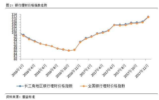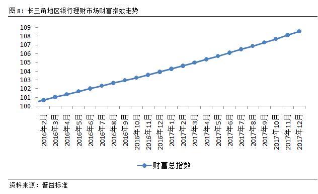 长三角地区银行理财财富累积增速加快。由于银行理财通常以预期收益的形式发行,因此收益与时间呈现正相关关系。由图可见,长三角地区银行理财市场财富指数随时间推移持续上行,仅有单月增幅差异的变化。2017年12月,长三角地区财富指数涨幅扩大,环比上涨0.42点至108.52点,长三角地区财富稳定累积。