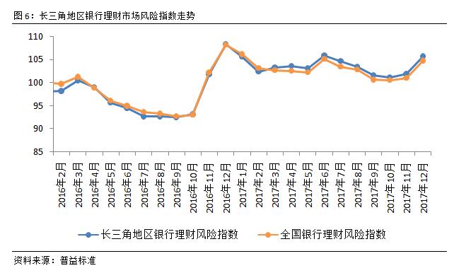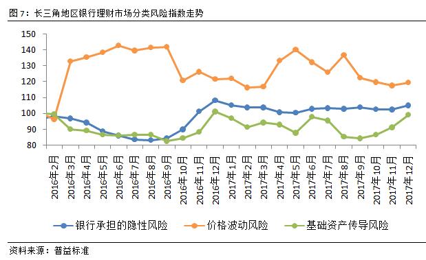 各类风险纷纷上扬,整体可控。本月,长三角地区银行理财市场各类细项风险均有所上扬。受年终市场利率显著上升的影响,市场风险偏好降低,加之过去一年大盘蓝筹股上涨较多,部分机构选择集中卖出或转投其他方向,导致股市波动剧烈,进而导致银行理财市场基础资产传导风险上升较多,这也是拉升长三角地区银行理财风险的主要原因;年末,各地区不可避免会出现一定波动,由银行承担的隐性风险出现合理上升;由于前期市场对流动性有一定预期,价格波动风险未出现明显上涨。随着更深层次金融改革的推进和对金融乱象的治理,预计各类风险将逐步得到化解。