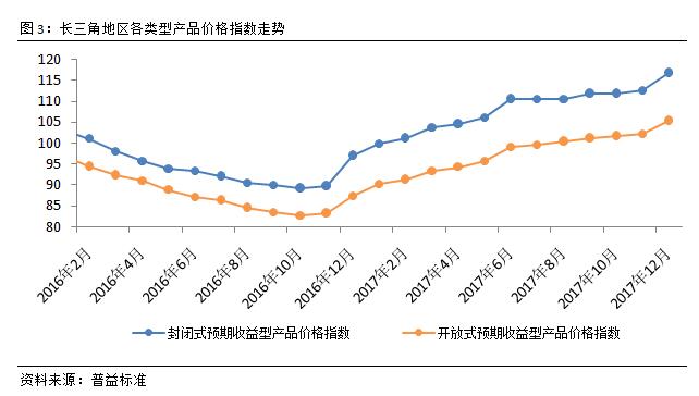 长三角地区银行理财各类价格指数均出现明显上涨。12月,长三角地区银行理财市场价格指数大幅拉升,环比上涨3.80点至112.17点。从不同产品类型来看,封闭式预期收益型产品价格指数本月环比上涨4.21点至116.73点;开放式预期收益型产品价格指数本月环比上涨3.19点至105.33点。封闭式与开放式预期收益型产品价格指数双双上涨,带动价格总指数进一步向上突破。