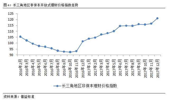 长三角地区非保本开放式理财价格指数进一步跃升。从上月开始,长三角地区非保本开放式理财价格指数已有上涨迹象。本月,在年末效应的影响下,银行理财各类价格指数纷纷上涨,长三角地区非保本开放式理财价格指数更是进一步跃升。预计随着年末时点过去,该类价格指数将逐步回落。
