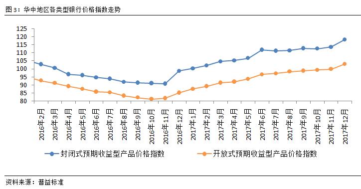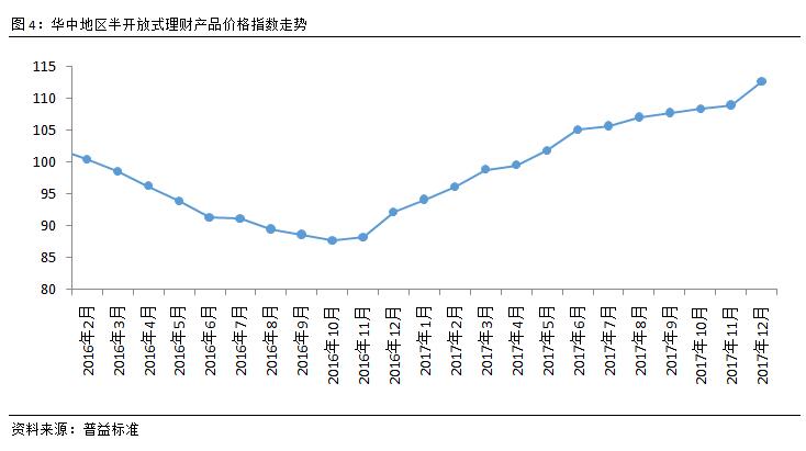 华中地区半开放式理财产品价格指数出现跃升。12月,华中地区半开放式理财产品价格指数出现跃升,涨幅明显增加。受年末流动性紧张影响,银行融资成本增加,各类理财产品价格指数均有所上涨。中央经济工作会议指出,稳健的货币政策要保持中性,管住货币供给总闸门,保持货币信贷和社会融资规模合理增长。因此,预计年后央行将继续对流动性的进行微调预调,华中地区流动性紧张将有所缓解,半开放式理财产品价格指数将逐步回落。