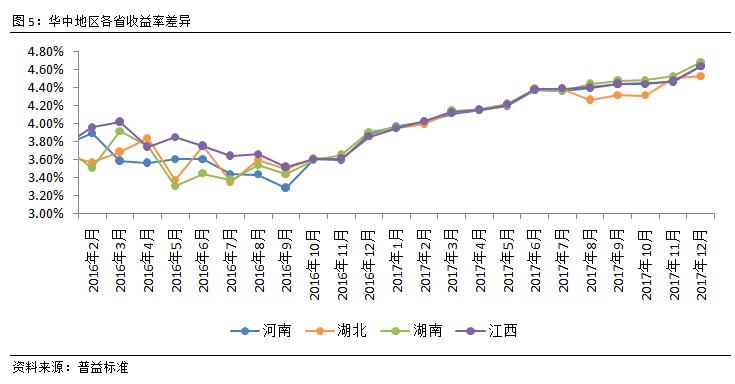 华中各省理财收益表现良好。本月华中各省收益楚翔不同程度上涨,整体表现良好。其中,河南湖南、江西三省银行理财产品收益较上月出现明显上涨,收益进入较高水平。而湖北省银行理财收益由于上月已有较大程度的上涨,本月采取较为稳健的策略,收益增势相对平缓。由于年末各金融机构对资金需求意愿强烈,致使其融资成本上升。从华中地区各省理财收益水平来看,湖北省银行理财收益相对其他三省较低,反映出该地区的资金需求较其他三省相对较弱。随着年末时点过去,预计华中地区银行理财收益水平将有所回落。