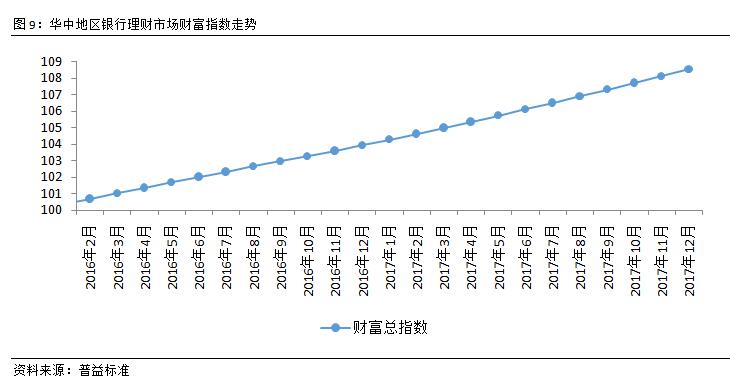 从财富指数来看,本月华中地区财富指数环比上涨0.42点至108.52点,银行理财财富继续稳定累积。