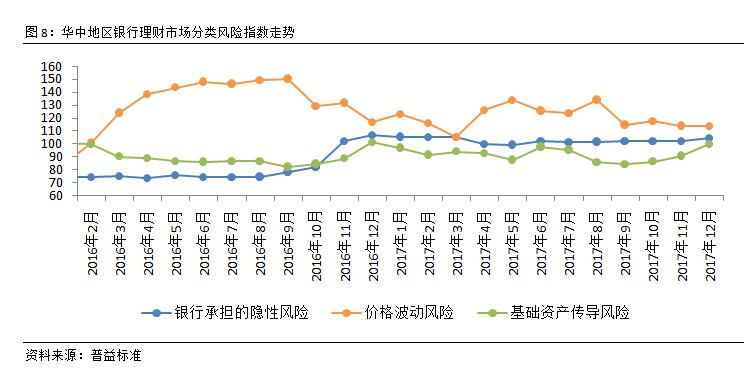 基础资产传导风险有所增加,价格波动风险持续下降,整体风险可控。12月,华中地区银行理财市场各类风险涨跌不一。其中,由银行承担的隐性风险有所上升,但仍处于低位;受年终市场利率显著上升的影响,市场风险偏好降低,加之过去一年大盘蓝筹股上涨较多,部分机构选择集中卖出或转投其他方向,导致股市波动剧烈,进而导致银行理财市场基础资产传导风险有所上升;由于前期市场对流动性有一定预期,华中地区价格波动风险近两月持续下跌。随着更深层次金融改革的推进和对金融乱象的治理,预计各类风险将逐步得到化解。