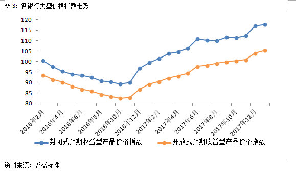 1月银行理财价格总指数环比上涨0.93点至112.76点。相较12月的大幅上涨,1月的涨幅相对平缓,但整体走势仍然呈现上行表现。在2018年首月,资金面表现相对平稳。虽然月中缴税、缴准并叠加MLF到期等因素促使银行体系流动性略显紧张,但在央行货币政策工具CRA(临时准备金动用安排)、MLF(中期借贷便利)的长短期组合拳下,流动性扰动得到了较好地控制,资金面较过往同期维持在相对宽松的水平。不过值得注意的是,虽然市场整体流动性稳定,但银行资金融出意愿仍然偏弱,结构性偏紧的特征仍然存在,这也促使银行理财收益继续上涨。从各类产品的表现来看,封闭式产品价格指数为117.64点,环比上涨0.60点;开放式产品价格指数为105.43点,环比上涨1.41点。