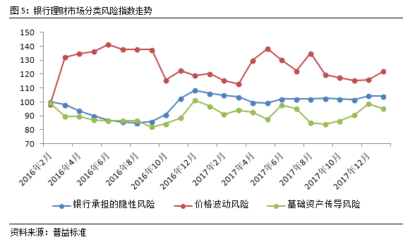 各类风险走势分化明显。1月,各类风险走势出现明显分化,致使整体风险维持平稳走势。其中,银行承担的隐性风险环比小幅下滑0.21点至104.18点,延续了持续一年的稳定走势;而价格波动风险在市场资金面趋紧,央行动态“填谷”的大环境中呈现了小幅上涨表现,预计该风险在春节前将持续上涨;基础资产传导风险经历了连续3个月的冲高后,于2018年1月重新回落,环比下滑3.62点。从近两年的风险走势来看,春节过后,在政策没有重大调整、无重大风险事件曝光的前提下,各类风险或将迎来稳定下行的走势。