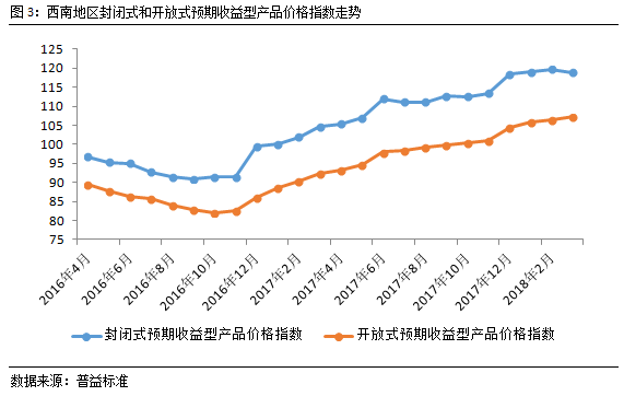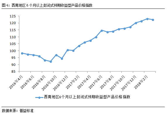长期理财产品价格指数小幅回落。从西南地区价格指数走势来看,2018年3月西南地区6个月以上封闭式预期收益型产品价格指数有小幅下滑,环比下滑0.61点至122.46点,涨幅为1.36%。从3月的变化趋势来看,长期限封闭式预期收益型产品定价在流动性环境相对宽松后迅速下滑,表明长期限银行理财收益有见顶趋势,此前的收益连续上行与流动性趋紧致使的资金需求较为旺盛的大环境有较大关系。受监管政策影响,未来银行理财产品的流动性表现或将出现较为明显的差异,对接标准化资产的产品,整体流动性将相对偏高,产品期限更为灵活,而对接非标类(如不禁止)资产的产品,投资期限将相对偏长,以保证产品期限与投资资产期限的一一对应。
