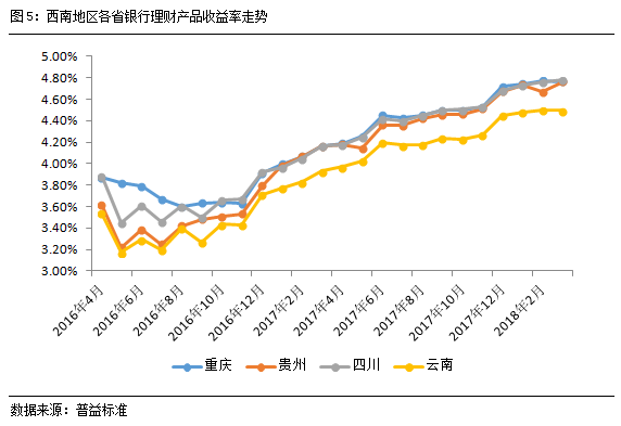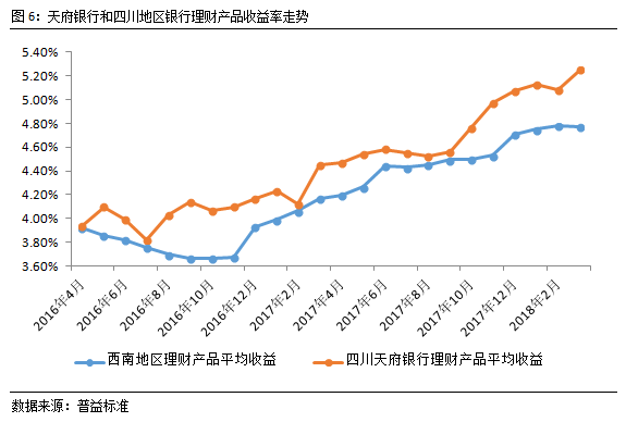 天府银行较西南地区收益领先优势继续扩大。进入2018年3月后,四川天府银行理财产品收益相较西南地区继续扩大。从具体表现来看,四川天府银行理财产品平均收益为5.25%,大幅上涨17BP;而西南地区平均收益仅为4.77%,环比下滑1BP。从产品定价角度来看,四川天府银行理财产品收益远高于西南地区平均水平,考虑到目前银行理财产品收益有较强的保障,投资者可直接根据收益高低选择理财产品。