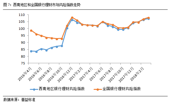 受政策环境影响,理财风险小幅上行。2018年3月,西南地区银行理财风险指数较2月继续上涨,环比上涨0.73点至107.26点。从近期风险指数走势来看,自2017年11月起,西南地区风险指数便呈现持续上涨态势,截至2018年3月该地区风险指数已上涨6.58%。具体来看,西南地区风险指数的持续上行与2017年末资管新规(征求意见稿)的出台有较大联系,新规对于传统理财业务模式的冲击促使银行未来理财业务在资产配置端及产品营销端都将迎来重大变化,而这种变化拉高了行业整体的不确定性风险,导致西南地区整体风险持续上涨。不过对比全国风险指数平均水平可以看出,西南地区风险指数仍然低于全国平均水平,凸显西南地区银行较强的风控水平。