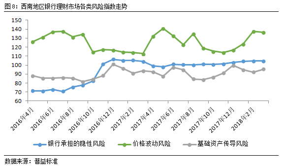 2018年3月,西南地区银行理财风险指数继续呈现微幅上涨态势,环比上涨0.73点至107.26点,涨幅较2月有所收敛,且整体风险仍低于全国平均水平,凸显该地区银行较为稳健的经营策略。从具体风险表现来看,3类风险仍然呈现明显的走势差异。其中,银行承担的隐性风险继续维持微幅上涨的走势,表明银行自担风险正持续积聚;基础资产传导风险在3月受债券市场杠杆水平抬升的影响,结束了连续两月的回落走势,不过短期上行变化不影响该类风险整体趋稳的走势;在3月趋于宽松的流动性环境影响下,价格波动风险微幅回落,不过考虑到4月有大量MLF到期,整体流动性呈现趋紧态势,不排除价格波动风险反弹上行的可能性。