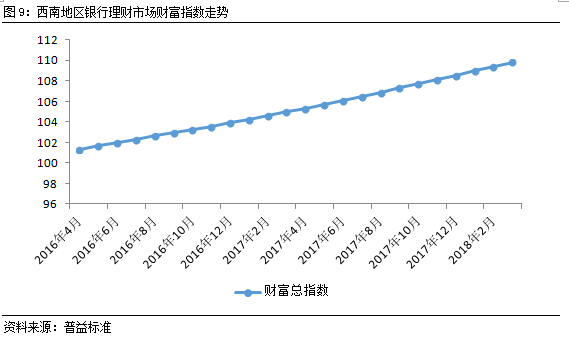 从财富指数来看,西南地区银行理财市场财富指数持续上行,3月环比上涨0.44点至109.84点,凸显出银行理财产品的增值、保值优势。