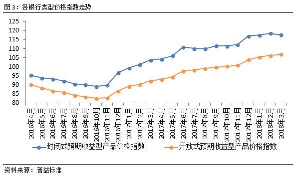 银行理财价格指数微幅下跌,整体处于稳定状态,不同开放类型产品价格指数变化差异愈发明显。3月,全国银行理财价格指数虽然环比下降0.2点至113.46点,但是幅度较小,整体波动可控。全国银行理财价格指数近几个月处于较稳定的状态。央行削峰填谷的公开市场操作,使得市场资金面波动减小,而央行行长易纲强调实施稳健中性货币政策的基调,总体上松紧适度,维护银行体系流动性的合理稳定,将使得理财价格指数的稳定得以维持。3月,在资金面回暖,短期流动性较充裕的情况下,不同开放类型产品价格指数走势分化。封闭式预期收益型产品价格指数环比下降0.81点至117.76点,开放式预期收益型产品价格指数环比上升0.7点至107点。开放式产品受资金面的影响相对偏低,整体收益变化具有一定的惯性。同时在季末考核的影响下,开放式有向上抬升的动力。实际上,封闭式产品收益在3月末也有明显的上涨,但是由于受月初回调影响,整体收益才呈现下滑表现。