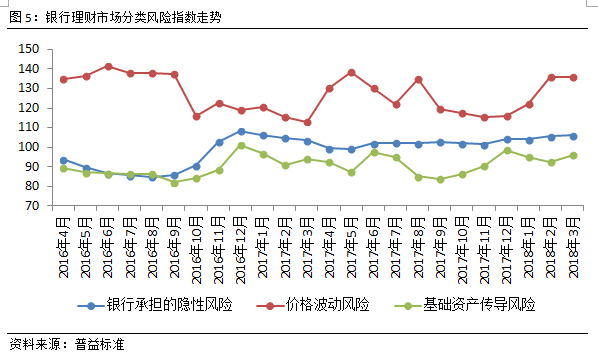 各类风险整体上升导致总体风险上升。本月,各类风险均有所上升,但是银行承担的隐性风险、价格波动风险较上月呈现上涨幅度收窄的情况,而基础资产传导风险却是由前两月下降的走势转为上升。一方面资管新规即将落地,若债券委外不再续做以致没有资金接手造成资产抛售,则会对债券市场的价格产生压力,而表内表外业务的腾挪形成的交易摩擦,短期内也将加剧基础资产价格的波动;另一方面,贸易摩擦的恶化,造成股市的暴跌,债市暴涨,资产价格波动加大。贸易摩擦下,双方进口商品价格上升或致使通胀压力的增大,其实质对经济影响的不确定性仍然较大。