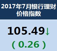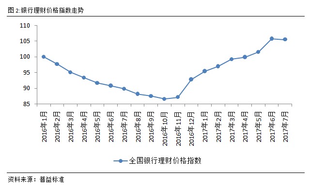 从7月指数变化来看,银行理财市场价格指数下滑0.26点至105.49点,虽然下滑幅度不大,但对比6月的上涨幅度,7月的下滑使价格指数整体走势呈现出极不平滑的变化。价格指数在7月的下滑主要是受两方面因素影响,一是央行表示要调控市场流动性后,持续收紧的流动性得到了明显的改善,资金供需关系日益缓和,理财产品收益向上动力持续下滑。另一方面,年中考核的完结,使得银行短期资金需求下滑,促使价格指数向上动力减弱。在短期因素逐步释放后,银行理财价格指数变化将更加趋于平缓。近期《2017年第二季度中国货币政策执行报告》中点明了中性的货币政策仍将延续,价格指数短期内较难出现大幅上涨或下滑的表现。