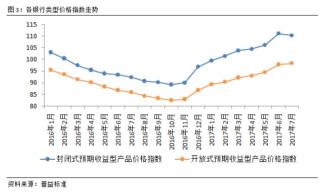 封闭式产品价格指数优势凸显。7月,全国范围内封闭式和开放式预期收益型产品价格指数表现存在一定的差异。其中,封闭式产品价格指数环比下滑0.78点至110.27点,下滑幅度为0.70%;开放式产品价格指数环比上涨0.50点至97.82点,上涨幅度为0.51%。从2017年两类指数的变化来看,封闭式预期收益型产品价格指数向上趋势更为明显,尤其在6月更是出现了一波明显的上涨;而开放式预期收益型产品向上幅度则更为平缓。随着年中考核等短期因素影响力的减弱,受其影响更大的封闭式预期收益型理财产品价格指数随之下落,而流动性更强的开放式预期收益型产品仍然维持了微幅向上表现。从近期监管态度的变化来看,资金面或将继续延续相对宽松的表现,两类价格指数较难出现大幅变化的情况。