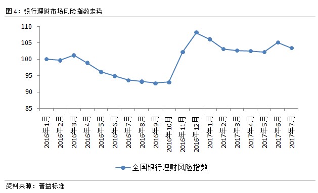 全国银行理财风险指数小幅下滑。2017年上半年,银行理财风险整体呈现较为平缓的下滑趋势,但在年中考核来临之际,短期资金压力促使银行理财风险指数明显上扬,而到7月,随着年中时点的过去,整体风险指数回落1.69点至103.44点。对于银行理财来说,这种时点性的风险变化不利于整体风险的把控,也并非监管所倡导的模式。不过在当前环境下,各类指标考核仍具有时点特性,因此银行较难在短期内通过自我调节降低时间节点期间的风险聚集程度。相对于银行,短期内监管对市场的调控或能更好的缓和时点性的风险上涨情况。这一点,从流动性调节后价格波动的持续下滑就可见一斑。另外,逐步引导银行理财产品从封闭式转向开放式或净值型,也能在较大程度上缓和时点性的风险变化。在短期压力逐步释放后,预计8月如无重大风险事件,风险指数将继续保持下行趋势。