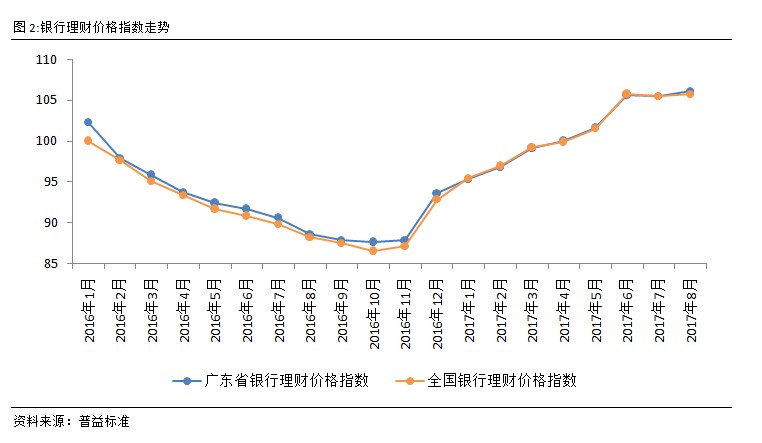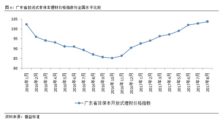 广东省银行理财价格指数重回上升轨道。广东省价格指数在8月重回上升轨道,达到自2016年年初以来的新高点。在金融去杠杆的严监管背景下,广东省银行理财价格指数今年以来持续上涨,虽然在7月出现了小幅回落,但我们认为是年中考核过去的正常表现,随着货币政策进一步收紧,资金成本难以下降,因此广东省银行理财价格指数在8月又回到了上升轨道。价格指数水平也可以反映一个地区银行理财市场的发展程度。将广东省银行理财价格指数与全国银行理财价格指数对比可以发现,广东省银行理财价格指数目前已赶超全国平均水平。作为沿海较早设有经济特区的发达省份,其银行理财市场的发展已较为成熟,在产品创新、业务拓展等方面已达到甚至领先全国平均水平。