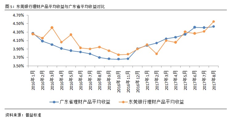 东莞银行理财收益大幅上升。本月,东莞银行理财产品平均收益延续了7月的上涨态势,且增幅扩张明显,与之相比较,广东省理财产品平均收益在年中考核后虽维持了上涨的态势,但由于年中考核使其收益已处于较高水平,上涨动力不足,增幅偏弱。从8月收益水平来看,东莞银行理财收益平均水平已处于广东省理财产品平均收益之上。从两类收益的走势变化来看,广东省理财收益自2017年年初以来一直呈现上涨的态势,年中考核过后涨幅有明显收窄,而东莞银行的收益已出现两个月的持续上涨,且收益涨幅进一步扩大,收益水平领先广东省理财收益平均水平较多。可以看出,随着监管进一步收严,东莞银行在净值型产品与MOM业务方面的布局已逐渐显出成效,投资者可适当增加对该行理财产品的关注。
