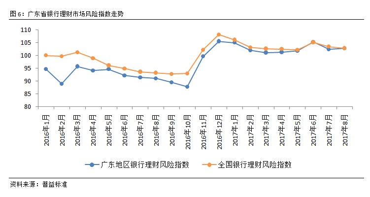 广东省银行理财风险指数与全国平均水平趋近。对比广东省和全国银行理财市场风险指数可以发现,8月广东省银行理财风险指数微幅上涨,而全国银行理财风险指数微幅下跌,两类指数水平趋近。具体来看,广东省银行理财风险指数在8月上涨幅度偏弱,风险可控。同时,全国银行理财风险指数微幅下跌,广东省整体风险控制水平与全国平均水平相当,说明作为经济发达的省份,其银行理财市场发展已较为成熟,区域性的特质风险较小。随着货币政策进一步收紧,银行理财负债端结构继续调整,广东省银行理财风险指数受产品结构调整的影响出现微幅上涨,随着产品结构调整的日渐完成及十九大召开的影响,全国及区域银行理财市场将维持稳定的状态,预计风险指数未来将出现下行态势。
