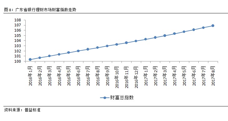 财富总指数平稳上升,广东省银行理财财富继续稳定累积。由于银行理财通常以预期收益的形式发行,因此收益与时间呈现正相关关系。由图可见,广东省银行理财市场财富指数随时间推移持续上行,仅有单月增幅差异的变化。2017年8月,广东省财富指数环比上涨0.39点至106.89点,环比上涨幅度为0.37%。该财富指数平稳上升,广东省银行理财财富继续稳定累积。