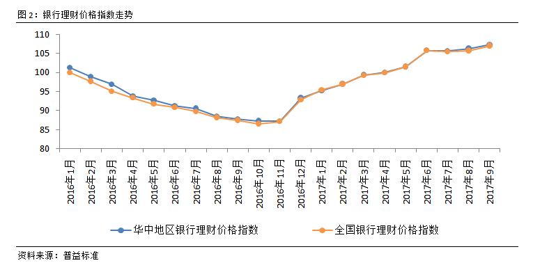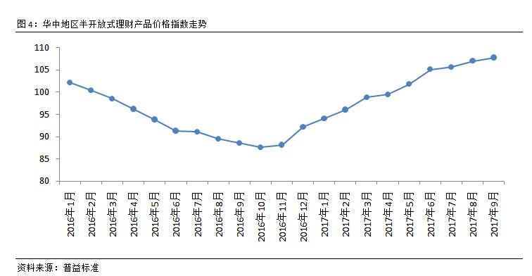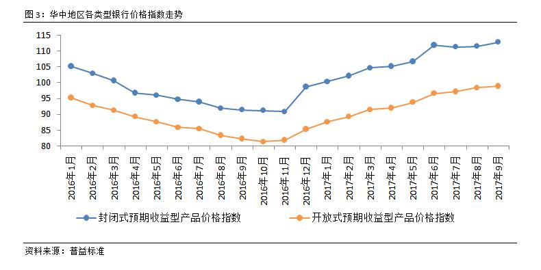 华中地区封闭式产品价格指数涨幅进一步扩大。2017年9月,华中地区银行理财价格指数延续了8月的上涨趋势,且涨幅进一步扩大,环比上涨1.01点至107.24点。具体来看,封闭式预期收益型产品价格指数进一步上涨,环比上涨1.30点至112.79点,开放式预期收益型产品价格指数则延续了一贯的平缓上涨态势,环比上涨0.57点至98.92点。封闭式预期收益型产品价格指数的进一步上涨是带动整体价格指数上涨的主要原因。