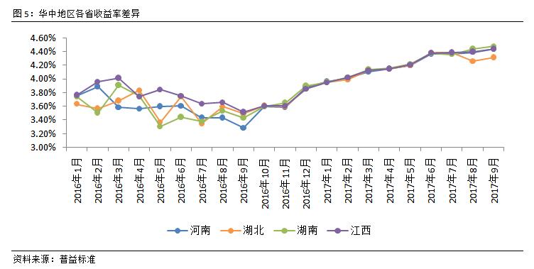 湖北省理财收益重回上升轨道,华中各省收益普涨。9月,湖北省理财收益转跌为升,华中各省银行理财产品收益均出现不同程度的上涨。其中,河南省银行理财产品收益为4.44%,环比上涨5BP;湖北省银行理财产品收益为4.31%,环比上涨5BP;湖南省银行理财产品收益为4.48%,环比上涨4BP;江西省银行理财产品收益为4.44%,环比上涨4BP。华中地区各省收益上涨势头较为强劲,华中地区整体收益趋势短期或将继续上行。