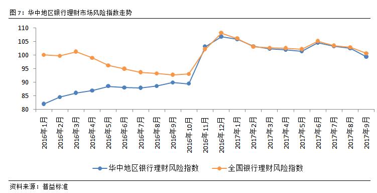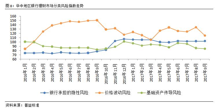 从风险指数来看,9月,华中地区银行理财市场风险指数加速下滑,环比下降3.07点至99.37点,已跌至100点以下。其中,银行承担的隐性风险继续在低位震荡,有小幅上升;随着银行产品结构调整的逐步推进,市场局面逐渐明朗化,价格波动风险大幅下跌,这也是带动整体风险下行的主要原因;9月,央行通过货币政策工具向市场释放近4000亿流动性,维稳意图明显,货币市场利率保持平稳,债市表现较为稳定,因而基础资产传导风险继续下行。