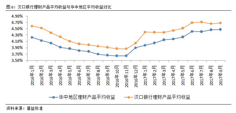 汉口银行理财产品收益转跌为升,持续领先地区水平。经历了8月的小幅下滑过后,9月汉口银行理财产品收益重新攀升。一方面受季度末时点性因素的影响,本月有大量同业存单到期,银行面临较大的流动性压力,银行资金成本难以下降;另一方面,长期来看,市场资金面仍然趋紧,这也致使汉口银行及华中地区理财产品收益继续上涨。从收益水平来看,汉口银行理财产品收益持续领先华中地区理财产品收益,说明汉口银行产品管理与风险控制能力较为稳定,且处于地区平均水平之上,值得投资者关注。