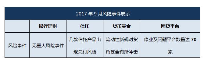 2017年9月,银行理财市场整体未显露重大风险事件。在今年严监管的背景之下,银监会系统公布的罚单近2300张,对于银行乱象起到了极大的遏制作用,也促使银行理财的潜在风险持续降低。因此现阶段银行理财整体风险较小,符合投资者资产保值投资品的需求。相对而言,同为低风险产品的货币基金,由于近年来的高速扩张以及收益的迅速上扬,潜在流动性风险迅速积聚,引起了监管的重视,致使近期多份文件开始对货币基金的投向、流动性管理等做出限制。其中,10月1日实施的《公开募集开放式证券投资基金流动性风险管理规定》将影响货币基金的投资比例和结构,或将促使货币基金收益迎来下调。相比较两类低风险产品的表现,信托理财业务的整体表现相对稳定,但房地产信托仍然面临一定的风险。随着房地产市场调控的推进,房地厂投资收益呈现持续收缩的迹象,再加上对房地产金融政策的收紧,致使开放商的再融资难度增大,流动性链条变得更为脆弱,因此信托理财产品潜在风险仍然值得投资者注意。9月,互联网平台的风险呈现井喷表现,停业及问题平台数量较8月大幅增加,仅跑路平台数量便达12家。虽然P2P的相关规范持续进行,但前期堆积的风险仍然没有释放完全,在9月更是出现了多达70家的停业及问题平台。9月中,《上海市网络借贷信息中介机构事实认定与整改工作指引表》的流传凸显了监管层仍然没有松懈对于P2P行业的整顿力度,预计10月问题平台数量会有所缓和。