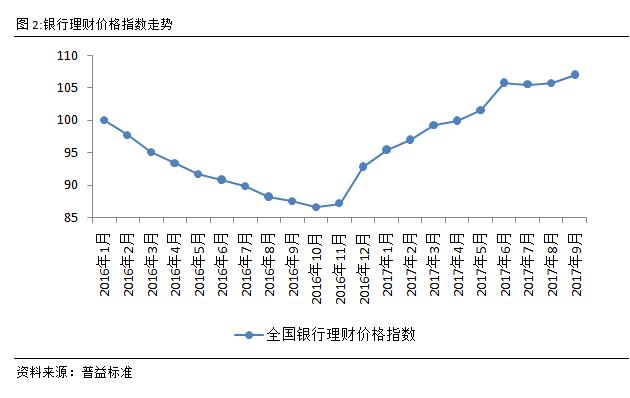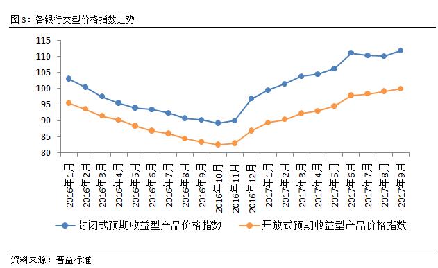两类产品价格指数差异呈现持续放大趋势。9月,全国范围内封闭式和开放式预期收益型产品价格指数均呈现上涨走势,但涨幅却有明显差异。其中,封闭式产品价格指数环比上涨1.65点至111.73点;开放式产品价格指数环比上涨0.70点至99.86点。虽然封闭式产品在7月及8月均出现了一定的下滑,但9月的上涨幅度偏大,使得9月封闭式预期收益型产品价格指数超越了6月的高点,创出历史新高;开放式预期收益型产品价格指数也达到了历史高点,但整体变化幅度封闭式产品差异较大,上涨趋势更为平滑,受短期时点效应影响较小。对比2016年的走势变化来看,10月各类理财产品价格指数或将迎来小幅回落,之后受年末效应影响,整体向上趋势不变,因此投资者可以在近期考虑短期理财产品购买。