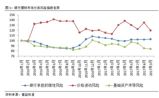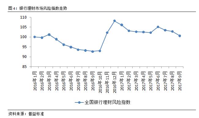 9月银行风险指数明显下滑,环比下滑2.23点至100.60点。虽然2017年整体风险指数持续下滑,但从9月表现来看,与2016年同期相比仍然偏高。不过在金融严监管环境下,银行理财市场风险的消除是有目共睹的,因此,风险指数的长期下行趋势是可以预见的。从具体风险指标变化来看,基础资产传导风险及银行承担的隐性风险均维持了相对平稳的变化表现,对于整体风险指数的影响程度偏小。而价格波动风险则表现出了明显的回落,并推动整体风险明显下滑。从三类风险指数的走势来看,价格波动风险对于市场的变化更为敏感,促使其波动相对更大。因此随着年末临近,受资金面收紧的影响,价格波动风险或有上涨可能,增大了短期风险指数上行的可能性。