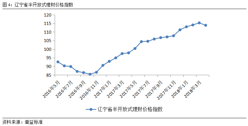 4月辽宁省半开放式理财价格指数明显回落。从辽宁省半开放式理财走势变化来看,4月该指数出现了较为明显的下行变化,环比下滑1.42点,至113.87点。相比较封闭式理财产品趋于平稳的走势,半开放式理财产品价格指数回落表现更为明显,基本对冲了3月受季末时点因素影响半开放式理财产品上涨走势。